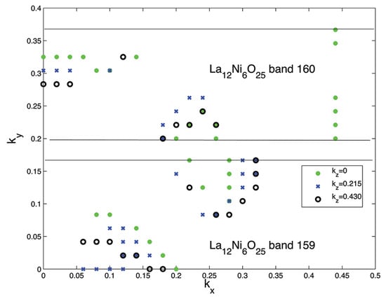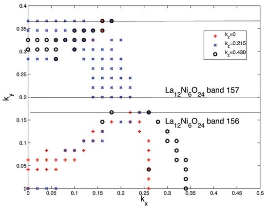 The doped cases are simulated in calculations where one or two empty interstitial sites have been replaced by O-i atoms. The total number of sites are different for the different calculations and with different total number of k-points. Information about this, the size of atomic spheres, basis set, and so on can be found in previous papers [,,]. Please note that our work is based on density functional theory (DFT) where correlation is a global function of the spin densities [,]. and it is expected to be valid for cuprates and nickelates where doping is far away from half-filling. ARPES (angular-resolved photoemission spectroscopy) and ACAR (angular correlation of positron annihilation radiation) on cuprates have detected FSs and bands in agreement with DFT calculations [,,]. Here we discuss mainly paramagnetic band results, but the calculations for LNO lead to ferromagnetic (FM) ground states, even though the FM moments decreases on Ni sites near to the O-i wires [].