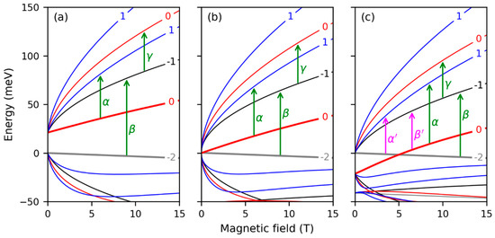 The fact of the phase transition, however, can still be observed from these experimental data. To do this we suggest another approach based on the qualitative difference in the structure of the transition lines in TI and BI. For TI state there are two transitions, α′ and β′ (see Figure 1c) that are forbidden by the selection rules in the simple model we use. For electric-dipole excitations in Faraday geometry a transition can change LL number N by ±1 and cannot change its spin projection on the z axis. Transition α′ is not allowed because it changes the LL number by 3 and β′ implies a spin flip (for more details see e.g., [14]). The corresponding lines, however, can be observed because of mixing of the zero-mode LLs near the crossing point [8,15] (line α′ is shown on Figure 2f). Hence in magnetoabsorption experiments we cannot observe the crossing of LLs directly, but we can see the consequences of LL mixing (i.e., emergence of lines α′ and β′) allowing detection of the TI state. The limitation of this method is that anticrossing can be clearly seen only when Bc is high enough so that α and β transitions are not forbidden by the Pauli principle and the crossing point does not fall in the restrahlen bands (see Figure 2f). Consequently, in the vicinity of the conditions corresponding to the phase transition when Bc is close to zero no manifestation of the LL anticrossing can be observed (see Figure 2g,h).