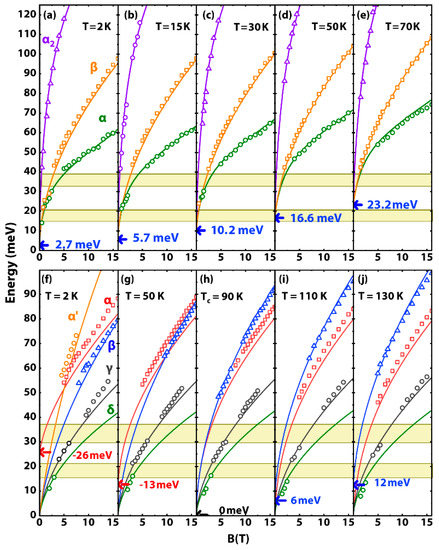 Another approach is to analyze α and β lines in high magnetic fields where they are clearly seen at all temperatures. In Figure 1 one can see that the energy of the lower level of α transition (N = 0) goes up with the magnetic field while the energy of the lower level of β transition (N = −2) goes down. On the other hand, the energy of the upper levels (N = 1 and N = −1) goes up for both transitions. Thus, the energy of β line will always have a higher derivative over the magnetic field than the one of α line. Because of this in BI state β line lies above α line and never crosses it (Figure 2a–e). Our calculations show that in TI state β line starts from zero and should cross α line at some point, however, in the experiment we see two parallel lines (see e.g., Figure 2f,g). We believe that it comes from the magnetic field being too weak to reach the α-β crossing point. The lines look parallel because their energies close to Bc are affected by the aforementioned α-α′ and β-β′ anticrossing [8,15]. Hence at these conditions the behavior of the α and β lines predicted by a simple axial model cannot be observed due to interference with low symmetry effects around Bc and the limitation of the maximal magnetic field. At critical temperature the crossing of α and β lines was observed (Figure 2h). Above the critical temperature we can clearly see that β line (that has higher slope) lies above α line as expected for BI state (Figure 2i,j).