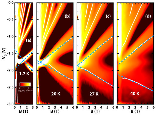 The alternative method that allows detection of the topological phase transition is based on magnetotransport measurements in a gated Hall bar [13]. The ability to set the Fermi level in a wide range by the applied gate voltage Vg, allows one to perform a magnetotransport mapping of the structure of LLs of the sample. As it was proposed in the pioneer paper by Büttner et al. [3], the peaks of ∂σxy/∂Vg curves give the precise positions of crossings between the Fermi level and the LLs. Therefore plotting ∂σxy/∂Vg for each magnetic field value makes it possible to reveal the dispersion of the LLs (see Figure 4).