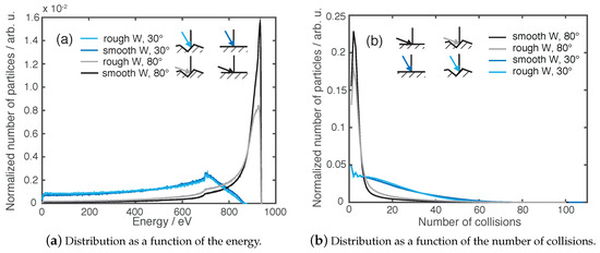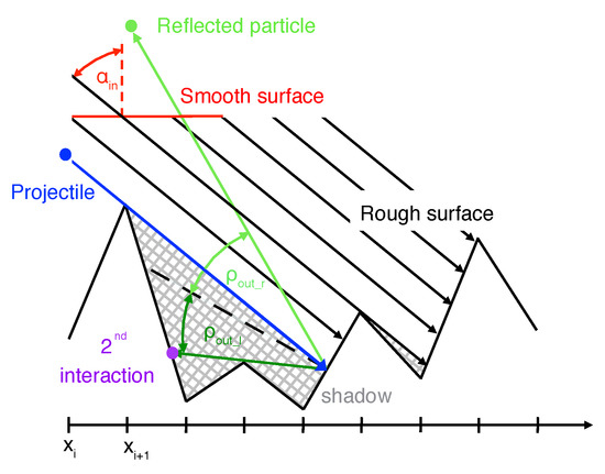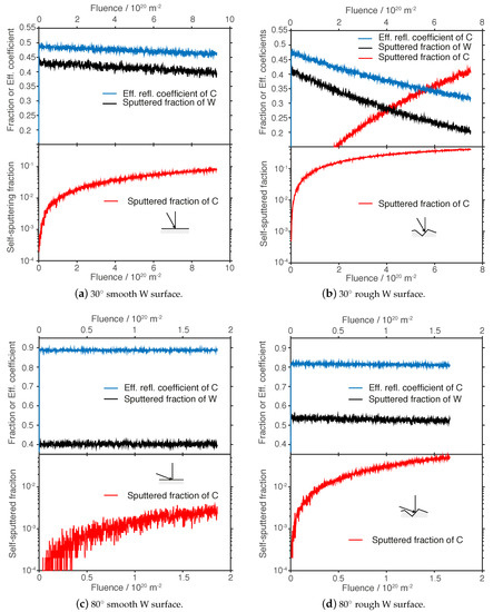 Figure 8b). In this study, it is shown that a higher surface roughness leads to an increase in absolute values of the effective reflection coefficient and sputtered fractions as the angle of incidence with respect to the surface normal is increased. Furthermore, an enhancement of