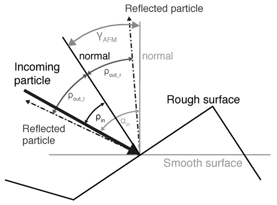 Definition of angles and reference systems for the pre- and post-processing: represents the fixed incidence angle to the smooth surface, the angles of incidence to the rough plane and the angle which is measured with an atomic force microscope (AFM). The angles and represent possible exit angles of one reflected particle. In this picture = . For a cosine angular distribution with its center around the surface normal, both angles have the same likelihood.