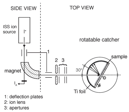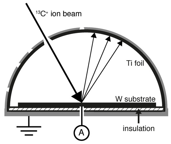 13C atoms on the Ti catcher foil in an azimuthal plane of 0°. The catcher as well as the mounted Ti catcher foil are on ground potential and have a radius of 6 mm. Possible incidence angles of the projectile beam are defined by entry apertures in the catcher and start from normal incidence with 0°, 30°, 45°, 60°, and 80° with respect to the surface normal. For each experiment, a Ti foil with a hole aligned at one of the entry aperture positions is prepared. The W sample is insulated from the catcher with a Kapton foil (hatched) to allow monitoring of the ion beam current.