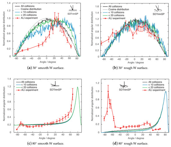For particles impinging with an incidence angle of 30° on a smooth W surface, the experiment shows a higher specular reflection than observed in modeling. Particles in the simulation have a greater number of collisions and are ejected with a cosine distribution. Thus, by comparing experimental and numerical data, the location of the maximum of the angular distribution is correlated with the number of collisions in the collision cascade.