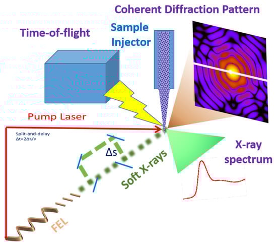 One of the most intriguing challenges in modern scientific research is the capability of monitoring transient atomic motions that govern physical, chemical and biological phenomena, measuring structural molecular changes of reacting species over few Ångstrom lengths on sub-picosecond timescales. The standard approach used to investigate structural dynamics is the pump–probe scheme, in which light pulses are used to first excite (pump) and subsequently interrogate (probe) a system []. The use of intense, ultra-short, soft X-ray radiation pulses such as those generated by the EuPRAXIA@SPARC_LAB FEL would tremendously benefit pump–probe investigations, whereof two different situations will be addressed: on the one hand, X-ray pulses can be exploited as pump pulse for stimulating chemical reactions or for generating coherent excitations, and, on the other hand, they can be used as selective probe to monitor the evolution from reactant to photoproduct.