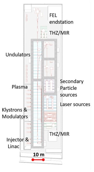 THz/MIR radiation will be generated at EuPRAXIA@SPARC_LAB through different production schemes based on ultra-short, i.e., ≈10–100 fs, electron bunches. Two beam lines are considered in the first phase of the EuPRAXIA@SPARC_LAB project: one at low energy, i.e., 30–50 MeV, and the second one at higher energy, i.e., 1 GeV, in proximity of the FEL extraction site (see Figure 2).