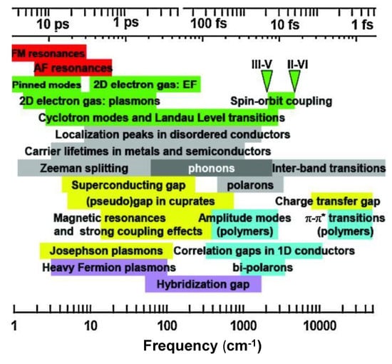 The potential of THz and MIR frequency and time domains spectroscopies are displayed in Figure 6, where we show a not exhaustive review of excitations whose characteristic energy are in resonance with those of specific processes.