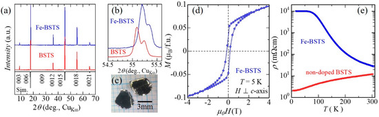 Grown bulk single crystals of Fe-BSTS can be easily cleaved at the (0 0 l) planes (Figure 1c). The X-ray diffraction (XRD) from the cleaved planes showed only clear sharp 00l peaks (Figure 1a). The small peaks at slightly lower angles before the high-intensity peaks (e.g., ~40° and 50°) corresponded to reflections of the 00l peaks from the weak CuKβ contributions. Higher angle peaks showed clear CuKα1-CuKα2 peak splitting, with slight peak broadening compared with non-doped BiSbTe2Se (BSTS), ensuring good crystalline quality (Figure 1b). The slight peak shift toward higher angles by the doping indicates lattice shrinking. Indeed, the lattice parameter c of Fe-BSTS was c = 29.96 Å and was slightly smaller than that of BSTS [30], reflecting substitution with smaller atoms of Fe for larger (Bi, Sb) sites. In addition, we also tested the powder XRD measurements of the ground crystal flakes and confirmed that no extra impurity phase was detected. To determine the Fe concentration and distribution of the obtained crystals, we conducted X-ray fluorescence analysis (XRF) to the crystals after the XRD measurements. The typical analytical Fe composition was ~0.01, and this Fe distribution of crystal flakes, at several mm2, was almost homogeneous within the analytical accuracy of XRF. Figure 1d shows the magnetization of the crystals measured at 5 K and indicates ferromagnetism with a narrow hysteresis loop. The saturation magnetization was around 0.065 μB per formula unit. This value can be understood by considering the analytical chemical composition and a possible ionic state of high-spin Fe3+ (5 μB). Therefore, these results indicate that the ferromagnetism observed here is caused by Fe doping in the BSTS, establishing a ferromagnetic TI. Owing to the time-inversion symmetry induced by the ferromagnetism, a gap opening at the Dirac point—i.e., a massive Dirac cone state—should be realized as well, as in [31].