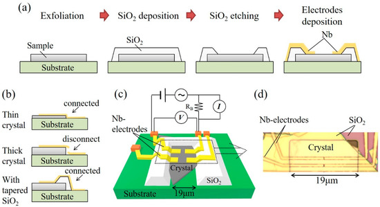 One additional benefit of this process is that we can easily achieve good electrical contact even for thick crystals due to the naturally tapered shape of SiO2 formed during SiO2 deposition and RIE etching (see schematic picture in Figure 2b). To obtain good side-wall coverage, electrode deposition is usually conducted with substantial angles, as adopted by Stehno and colleagues [37]. However, our fabrication procedure does not require these techniques.