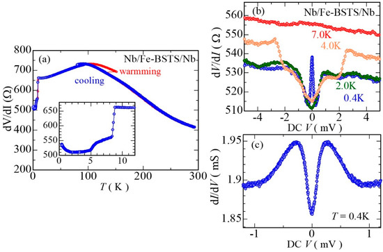 (a) The temperature dependence of the zero-bias differential resistance of the S/Fe-BSTS/S junction. Due to a technical reason, the resistance showed hysteresis only at around 100 K. Inset is an enlarged graph around 10 K; (b) differential resistance dV/dI of the junctions at 0.4, 2.0, 4.0, and 7.0 K; (c) differential conductance dI/dV of the junctions recorded at 0.4 K. The data itself are same as the dV/dI at 0.4 K.