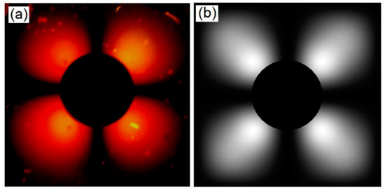 Light polarization observed in the Ferrolens for the dipolar configuration (a), using a neodymium cube magnet (0.5 × 0.5 × 0.5) cm. In (b) simulation of light polarization using hyperbolic polynomials.