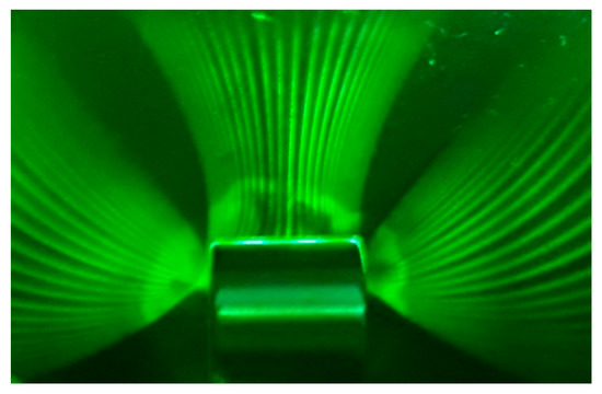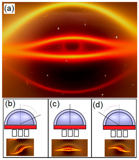 In this way, the magnetic contours are analogous to the orbits of dynamical systems, because these contours are associated to a vector field, and the trajectories of these orbits are obtained by the diffracted light, which consists of light patterns irradiated from the liquid film, and these light patterns can be related to some magneto-optical effects, depending on the relative position of the viewer and the light source. In Figure 9 we present the top view of two light patterns obtained using a straight line of LED’s, in the case of a polar configuration in Figure 9a and a dipolar configuration in Figure 9b, for the same straight line of LED’s. To exemplify the dependence of the position of the light source, in the case of the dipolar configuration in Figure 9b, we are presenting the pattern of Figure 10, the sequence of curved light lines from placing a straight line of LEDs far from the magnet.