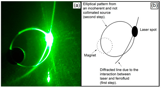 Light diffraction phenomenon with collimated and uncollimated light observed simultaneously (a). The laser beam (coherent and collimated source of light) passing through the Ferrolens, while the formation of an elliptical light pattern in the plane of the Ferrolens is caused by light scattering of non-collimated light. The formation of patterns is a two-step process. This can be observed simultaneously in this figure, in which the first step is the diffraction of the green laser light through the Ferrolens in the presence of a magnetic field, projecting a curved line in the screen, with an intense light spot obtained due to the direct projection of the laser. The next step is obtained by the light spot of the laser hitting the screen, changing it to an uncollimated light source. In (b) a diagram illustrates this.