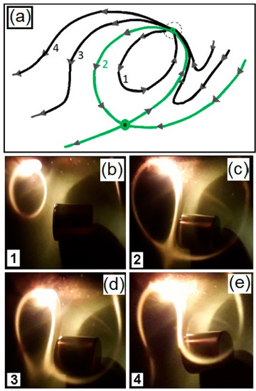 The attractor obtained in Figure 17a gives us one example of the power of visualizing its structure, using this device. In this case, we are using three magnets in the tetrapolar configuration (Figure 4e), with a disc of white light as a light source. This source of non-collimated light is the white disc on the left, and the cylindrical magnets are placed at the right side, at the top, in a tetrapolar configuration. The trajectories escape from the white disc of light, passing close to the magnets, and they return to the white disc, closing the circuit, forming a ribbon of light. As we saw previously, the region close to the vicinity of a dipolar configuration can create a saddle point, in which the trajectories are attracted in one direction and repelled in another direction. In the tetrapolar configuration, we have at least two saddle points at each side of these three cylinders. This configuration develops the curved structure inside the attractor, and in this part of the attractor, the ribbon of light gives half a twist, like the case of a Möbius strip. In Figure 17b, we present a top view of this curved structure close to the magnets, where we can see the three magnets at the top, with the two saddle points and the light trajectories with a torsion at the center of the bottom part of this figure.