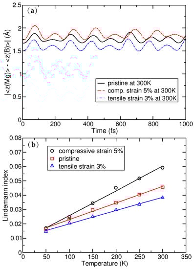 Figure 2a shows the average distance between Mg and B atomic layers, as evolved over a time of 1 ps. Throughout the simulation time, there is no further evolution of the z-coordinate and the Mg atom shows only oscillatory movement around the equilibrium positions (as is shown in Figure 2) Importantly, the separation indicates that the Mg atoms do not leave the surface of the MgB crystal. The plane in which the Mg atoms reside shifts away from the plane of the B atoms on average by 0.09 in a compressed crystal, while the distance between the planes decreases on average by 0.42 in the stretched system. This (relatively larger) shift in the latter case can be understood by analysing the details of the MgB atomic structure. When the crystal is biaxially stretched, its Mg–B bond lengths increase, which is partially compensated by the nesting of the Mg atoms in the hollow sites closer to the B sublattice. Despite these atomic shifts, the MD simulations show the structural stability of the system. The stability from the MD simulations can be further quantitatively derived from the global Lindemann index, the dependence of which on temperature is shown in Figure 2b. It is calculated for the pristine crystal, with a compressive strain of 5% and a tensile strain of 3%, from the local Lindemann indices, given by the formula