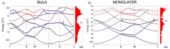 The calculated second-order elastic constants and other structural parameters for monolayer are given in Table 1. All elastic constants related to the bulk material (those that have 3, 4, or 5 in their subscripts), are calculated close to zero, as is expected for the monolayer. Compared to similar 2D materials, the layer modulus of of 30.18 is relatively small (in the range of Silicene and Germanene), roughly five times smaller than that of graphene or h–BN, for example [42,43]. Similar results are obtained for the Young modulus. Compared to borophene (two-dimensional boron sheets with rectangular structures) [44], which is a hard and brittle 2D material that exhibits an extremely large Young’s modulus of 398 N/m along the a direction [45], the MgB monolayer has a significantly smaller value of 63.29 N/m. The most interesting observation in the elastic properties of the monolayer is that the constant is negative, which gives a negative Poisson ratio in the a and b directions, too—although, with a very small negative value of −0.05. However, compared to 2D borophene, which has an out-of-plane negative Poisson’s ratio (that effectively holds the strong boron bonds lying along the a direction and makes the boron sheet show superior mechanical flexibility along the b direction [46]), we obtain similar values [45]. For comparison, graphene has a Young modulus of 352.2 and a Poisson ratio of 0.185 [42]. After confirming its stability and determining the elastic properties of the MgB monolayer, we study its electronic properties. In Figure 3, the electronic structures of bulk MgB and the MgB monolayer are presented. The band structures for the bulk along the high-symmetry points -K-M--A-L, and for the monolayer along -K-M- were calculated. The Fermi level is set to zero. The band structure of the bulk is in full agreement with previous studies [10,47,48,49]. The two bands crossing the Fermi level play a crucial role in the electronic properties of MgB. The density of the states around E are predominantly related to the B atoms and their p-orbitals, whereas the Mg atom contribution is negligible in this region. Previous studies described Mg as fully ionized and showed that the electrons donated to the system are not localized on the anion but, rather, are distributed over the whole crystal [6]. A similarity to graphite can be observed, with three bands, corresponding to the in-plane () hybridization in the boron layer and two -bands of boron orbitals [33]. Boron and orbitals contribute as and states. Analysing projected DOS, one concludes that the states are considerably involved in the total density of states at the Fermi level, while the states have only a partial contribution. It is worth emphasizing that the bulk bands of this material at the K-point above the Fermi level present a formation similar to the Dirac cones in graphene.