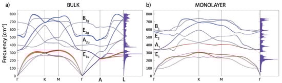 Figure 4 shows the phonon dispersions for both the bulk and monolayer. For the bulk (in Figure 4a), there are four optical modes at the point. Due to the light atomic mass of the B atoms and the strong B–B coupling, the two high-frequency modes almost have a pure boron character. The in-plane stretching mode E and the out-of-plane mode (where the atoms move in opposite directions B) are the boron atom modes. E is a doubly-degenerate Raman active mode and experimental studies [6,9] showed that this mode is very sensitive to structural changes and it has a strong electron-phonon coupling. The low-frequency modes (A) and double degenerate (E) are infrared active and they do not involve changes on in-plane bonds. In Figure 4b, the phonon dispersion of the MgB monolayer is presented. In the phonon spectrum there are no imaginary frequencies, which confirms, once again, the dynamical stability of the system (also demonstrated earlier by the MD calculations).