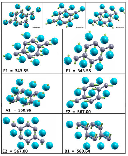 At the point, there are three acoustic and six optical modes (from which two pairs are doubly degenerate). The optical modes A, B, E, and E are related to the optical modes of the parent material. Two significant differences between the bulk and monolayer spectrum can be observed: The E and A mode become energy degenerate in the monolayer, resulting in either a slight softening (hardening) of the modes which leads to nearly equal frequencies, which opens a gap in the phonon density of states (DOS) between the acoustic and optical modes. A more significant effect concerns the softening of the B mode and hardening of the E mode. As in the bulk E mode, the monolayer E mode is strongly coupled to electrons, causing the superconductivity in the monolayer in a similar fashion as in the bulk. In Figure 5, the vibrational frequencies and normal coordinates for the MgB monolayer are presented. The symmetry group is , and the acoustic modes are A and E. The optical modes at the point are A, B, E, and E, where the infrared-active ones are A and E. The Raman-active modes are A, E, and E, and B is silent. In Table 2, the Raman tensor for the MgB monolayer is presented [52]. Similar to graphene, the phonon eigenvectors and the normal coordinates at the -point are determined by symmetry rules and, therefore, are a model independent.