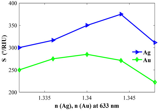 Sensitivity versus refractive indices of Ag (nAg) and Au (nAu).