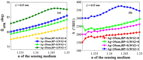 We also optimized the BP layers for the best sensor performance. Figure 7a shows the sensitivity versus number of BP layers. Figure 7b shows δθ and Rp plotted against the number of BP layers. The maximum sensitivity, minimum reflectance, and maximum change in resonance angle are observed for L = 3 layers of BP in the configuration.