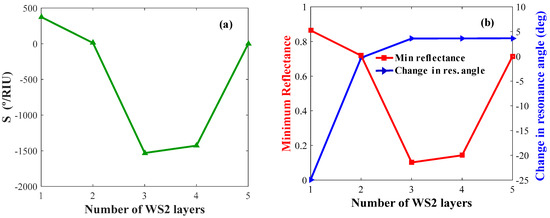 Layer optimization for WS2: (a) Sensitivity versus the number of WS2 layers (keeping Ag and BP constant); (b) change in resonance angle and minimum reflectance versus the number of WS2 layers.