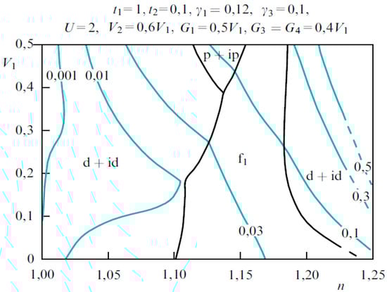 Phase diagram of superconducting state in the AB structure of the bilayer graphene [] shown as a function of the variables n − V1, where 1 < n < 1.25 is the carriers density, t1, t2 and γ1, γ2 are intralayer and interlayer hoppings, U is onsite Hubbard repulsion, V1, V2 and G1, G3, G4 are intralayer and interlayer Coulomb repulsions. The leading SC instabilities correspond to chiral p + ip, d + id and f1-pairing. For all the points on the same thin line the value of the coupling constant is constant.