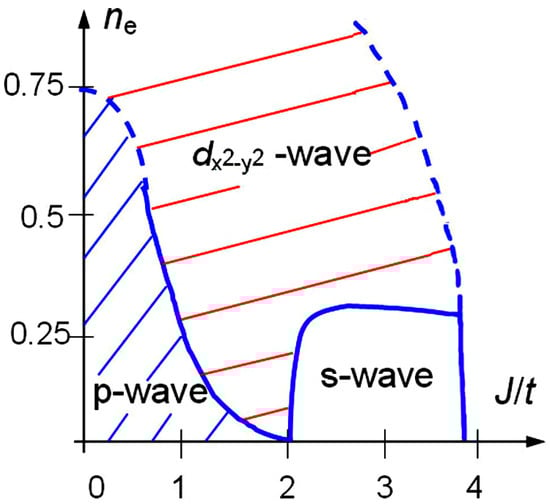 It has been shown that the critical temperature of the superconducting transition can be substantially increased at low densities by considering spin-polarization or the two-band superconductivity scenario [,,]. These results proved to be very important for related systems as in polarized 3He-4He mixtures, imbalanced Fermi-gas in the magnetic trap, as well as for heavy fermion superconductors and other mixed valence systems described by the two-band Hubbard model with one narrow band [,,,]. Together with T.M. Rice we also considered a superconductivity scenario in 2D t-J model at low and intermediate electron density [,] with van der Waals interaction which corresponds to strong onsite Hubbard repulsion and weak intersite antiferromagnetic (AFM) attraction. The phase-diagram of this model presented in Figure 2 shows regions of superconducting phases with different pairing symmetry: P-wave, s-wave and -pairing. For small values of J/t the phase-diagram of the 2D t-J model becomes equivalent to the phase-diagram of the 2D Hubbard model and according to the results [,,] is unstable at low electron densities towards p-wave superconductivity of the Kohn-Luttinger [] type. At large values of (which usually are not realized in cuprates) the system becomes unstable towards extended s-wave pairing. For the set electron densities (optimal doping) and the values of we get the critical temperature of the d-wave pairing typical for high-TC,