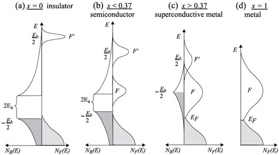 Interplay between Fermi and Bose subsystems in superconducting Ba1-xKxBiO3 [,,]: (a) insulator, x = 0; (b) superconductor, x < 0.37; (c) superconductive metal, x > 0.37; (d) metal, x = 1.