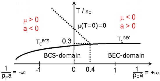 Note that to some extent the Femi-Bose mixture model naturally appears in the most difficult intermediate part of the phase diagram for the BCS-BEC crossover [,] between extended Cooper pairs (dilute BEC regime) and local pairs (or bipolarons [,]) which correspond to the weakly repulsive Bogoliubov gas [] of composed bosons (see Figure 4).