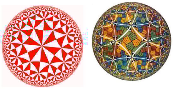 Tessellation of the hyperbolic Poincare’ plane: Showing the (6,4,2) triangular hyperbolic tiling (left side) that inspired the Escher Circle limit III panting (right side) (From M.C. Escher, Circle Limit III, 1959). from Wikipedia https://en.wikipedia.org/wiki/Circle_Limit_IIICC BY-SA license: http://creativecommons.org/licenses/by-sa/3.0/.