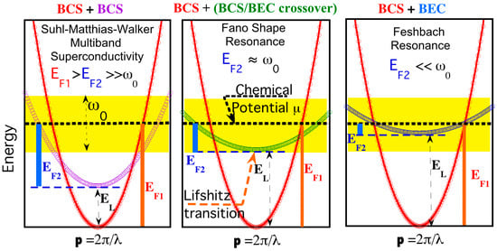 The “shape resonance” driven by Majorana exchange interaction between a first condensate in the BCS-BEC crossover and cooper pairs in a BCS condensate appears by tuning the chemical potential to the electronic topological transition called Lifshitz transition in a correlated interacting low dimensional metal [,,]. This non-standard and unconventional superconductivity scenario is completely beyond all BCS approximations and it was described theoretically by solving numerically the Bogoliubov anisotropic gaps equations at the same time as the density equation, called Bianconi-Perali-Valletta (BPV) approach [,,,,].