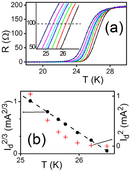 - Dean, C.L.; Kunchur, M.N.; He, Q.L.; Liu, H.; Wang, J.; Lortz, R.; Sou, I.K. Current-induced depairing in the Bi2Te3/FeTe interfacial superconductor. Phys. Rev. B 2015, 92, 094502–094506. [Google Scholar] [CrossRef]