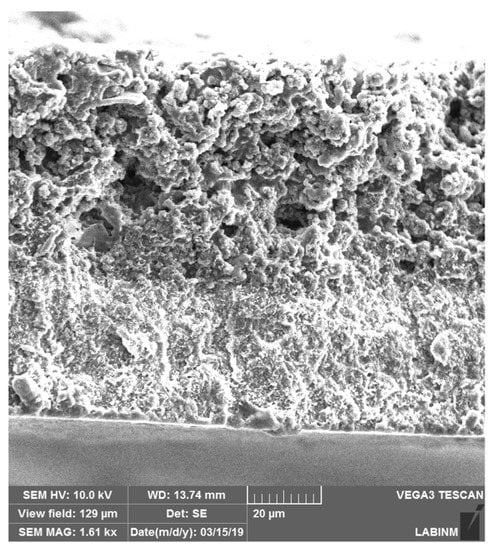 Figure 1 shows the SEM images of the obtained polymer PANI-PS/PVDF-TrFE composite material on the aluminum substrate. The ratio of the thickness of the layers PANI-PS (upper layer) and PVDF-TrFE (bottom layer) are equal to 60:30 μm. In addition, it should be noted that the layer PANI-PS has large porosity. The significant difference in the electrical conductivity of polymers makes it possible to clearly visualize the phase boundary (Figure 2a). However, the X-ray EDS analysis clearly demonstrates a presence of uncharacteristic elements (Fluorine in PANI-PS and sulfur for PVDF-TrFE) in the layers at distances up to 40 μm from the interface (Figure 2b,c). This fact emphasizes significant interlayer diffusion.