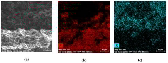 SEM image of PANI-PS/PVDF-TrFE interface (a); elemental maps of fluorine (b) and sulfur (c) for this area (after 4 cycles of measuring current-voltage characteristics).