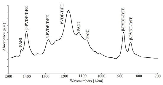 FTIR spectrum of the obtained composite material (Figure 4) demonstrates a presence of the peak splitting near 850 cm−1; the peaks 1285 and 1403 cm−1 also confirm the ferroelectric β crystalline phase of PVDF-TrFE [16,17]. The observed peaks 1155 and 1070 cm−1 characterize the conductive emeraldine salt form of PANI; the 1430 cm-1 band is typical for the emeraldine base form of PANI [18,19]. This fact testifies the partial protonation of emeraldine and confirms the semiconductor type of its electric conductivity.