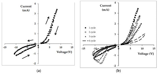 Current-voltage characteristics of PVDF-TrFE/PANI-PS bilayer structure for the first cycle (a) and for a sequence of 4 cycles (the interval between cycles is equal to 24 h) that illustrates a degradation of current-voltage characteristics (b).