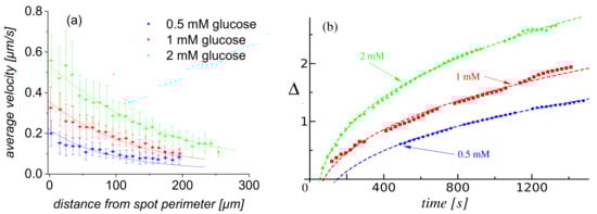 (a) Average velocity of tracer particles (see the main text) as a function of the GOX content of the printing solutions; and (b) dimensionless extent of the depletion zone, ), as a function of time, for various GOX concentrations of the printing solution. The glucose concentration was 0.5 mM in all three cases. The error bars in (a) show the standard deviations corresponding to the set of velocities of particles located within 20 m from the edge of the enzyme patch. The lines in (b) show the corresponding results of fitting with the theoretically predicted time dependence (see Section 3).