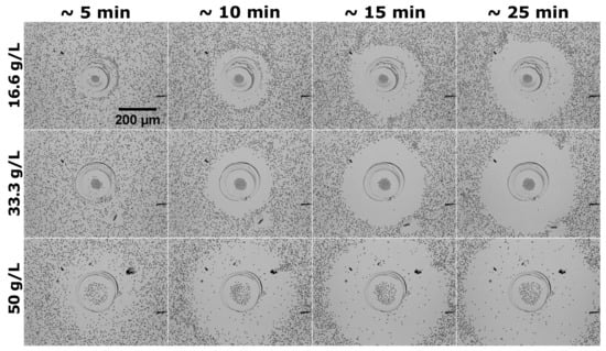 In the absence of glucose (i.e., when the enzyme pump is inactive), the sedimented silica particles were uniformly distributed around the enzyme patch and exhibit only Brownian motion (see the top row in Figure 1). Upon addition of glucose, which is the substrate for the GOX enzyme (and thus the activity of the enzyme pump is turned on), the tracers set in motion and exhibited a biased (though slow) outward motion (see Video S1 in the Supplementary Materials). This led to the emergence of a region depleted of tracers (see Figure 1, second to fourth rows), the extent of which increased in time with a rate that was increasing upon increasing the glucose concentration (compare the snapshots in the columns in Figure 1). These qualitative observations can be turned quantitative in two complementary ways.