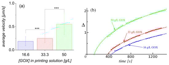 The behavior of the tracers for the pumps with varying GOX areal densities seems qualitatively similar to the behavior observed in the studies above, in which the glucose concentration was varied. Therefore, we analyzed in more detail only the time development of the depletion zone; the average velocity of tracers was determined only for trajectories, followed up to time , which started at from a distance d within from the edge of the enzyme patch. The results of the latter analysis, for a set of approximately 500 tracer particles dispersed around patches with different areal density of GOX, are shown in Figure 4a. As expected, this average velocity increased with the GOX areal density (more precisely, with the GOX-concentration of the solution from which the enzyme patch was fabricated), and the differences between the values at different densities were statistically “’highly significant” (the meaning of the *** symbols). It can be inferred, however, that the dependence of this average velocity of the tracers on the GOX-concentration was not linear. This can be understood by noting that, in the gels obtained by cross-linking GOX and BSA (see the details in Section 4.2), the amount of GOX was controlled rather than the activity of GOX. The latter is strongly dependent on the physicochemical properties of the microenvironment of the immobilized enzyme (thus, it does not necessarily change proportionally with the amount of enzyme) [1]. Accordingly, the measured changes in the average velocity were expected to be a combination of effects arising from both the different areal density and the different catalytic activity. In what concerns the time dependence of the extent of the depletion zone, similar to the observations related to Figure 2b, a certain time-lag was noted, which depended on the density of enzyme in the patch, between the start of the experiment and the emergence of the depletion zone. As discussed above, we infer that this reflects a transient regime of the enzyme pump, before the steady-state operation was fully developed.