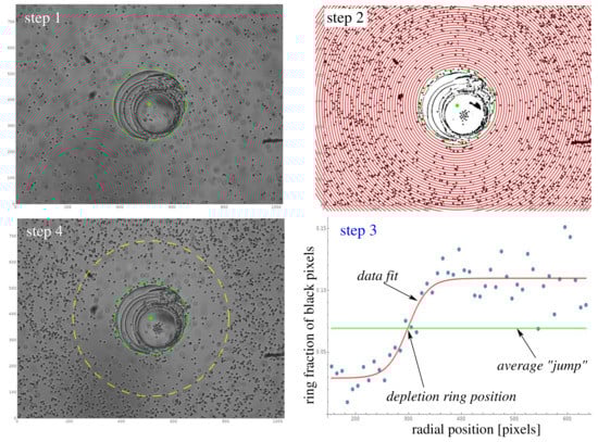 with fitting parameters. The fitting routine was robust, with the exception of the data corresponding to the transient regime at early times (after addition of the substrate, i.e., the “turning on” of the pump); the duration of this transient regime depended on the concentration of substrate (see the discussion in Section 2.2). This subset of early times data was visually identified and removed from the subsequent analysis. Upon fitting, the value of the parameter , i.e., the radial location of the inflection point (where the value of the “density” was the average of the low () and high () plateaux values; this is shown by the green line in Figure 6 “step 3”), was defined as the location of the outer ring of the depletion zone. This is shown by the yellow dotted circle in the optional step of visualization of the results (see Figure 6 “step 4”).