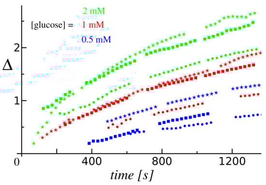 The results obtained by applying this procedure to the data from the available nine independent experiments are summarized in Figure 7. These reveal that, although the glucose-concentration dependence was a robust feature in each set of experiments involving a given pump, there was yet significant variability in the dynamics of the depletion zone at a given concentration from experiment to experiment. This could be due to several factors. The first one is the yet inherent variability in the composition of the enzyme patch (see also the discussion in Section 2.2), in the state of the glass support (i.e., uniformity of the APTES and BSA coverage), and in the average density of tracers in the monolayer. Another potential source of such variations from experiment to experiment is connected to the image analysis, in that the transition defining the location of the depletion zone is not sharp and its extent varies in time as well as with the average density of tracers. Finally, it is also possible that the variability exhibited in the current experiments reflects collective effects (which depend on the average density of tracers), if the assumption that the sedimented tracers form a dilute monolayer does not hold. Elucidating these aspects is left for future work.