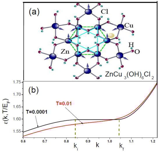 If the quasiparticles forming QSL are approximately dispersionless spinons (uncharged fermions), this state of matter becomes an SCQSL, [17,18,20,35,36]. If an insulating chemical compound has a 2D lattice, an SCQSL can emerge as a result of the lattice geometrical frustration. Most frequently, such frustration results in a dispersionless topologically protected spectral branch with zero excitation energy, called a flat band. This scenario realizes in herbertsmithite with its kagome planes [18,30,32,37,38,39], shown in Figure 1a. In this case, SCQSL has its quantum critical point at the FCQPT. As we have mentioned above, the SCQSL consists of chargeless spinons having the effective mass . Their momenta, as usual for fermions, reside in a Fermi sphere with momentum . Note that one frustrated valence spin is taken away to populate the approximately flat spinon band, as is displayed in Figure 1b. Such a behavior strongly resembles that of HF metals whose valence electrons form conduction flat bands, while the charges cannot form any band because of the large charge gap of herbertsmithite or another geometrically frustrated insulating magnet. This result is in agreement with the experimental data [40]. Therefore, the above insulating compounds have physical properties resembling those of HF metals. There is, however, a notable exception. Namely, while HF metals are good conductors, the typical insulator does not sustain the electric current [18,19,20]. Thus, both frustrated insulators and HF metals, having universal behavior, form a new state of matter [35].