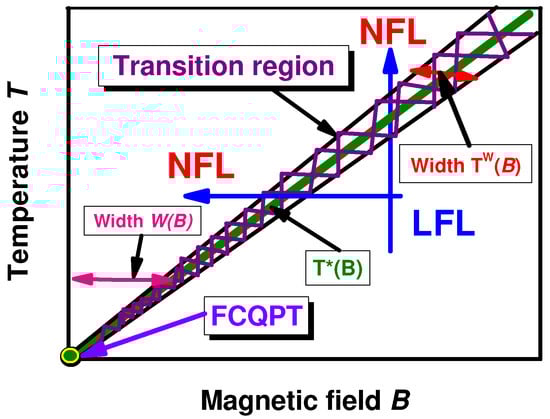 which directly follows from Equation (8). The line Equation (10) is indeed the function , so that the width of the NFL region is proportional to the temperature. It can be shown similarly that the transition region width is also [16,17]. We note here that in essence, the transition region represents the crossover between LFL and NFL phases. In our case, the NFL phase is formed by quasiparticles that occupy the so-called fermion condensate (FC) state, in analogy to the Bose condensate for particles obeying Bose–Einstein statistics. (See [16,17] for a comprehensive explanation.) In a “pure” FC state, all fermions (quasiparticles) having momenta in a finite interval embracing the Fermi surface have energies pinned to the chemical potential. In reality, this state cannot be reached because of the Nernst theorem [45], and the NFL features arise from “traces” of the FC state manifested at finite temperatures. Moreover, at low but finite temperatures, the magnetic field acts to suppress NFL behavior (i.e., the “FC traces”) and, upon growing sufficiently strong, restores the LFL phase. On the other hand, thermal fluctuations destroy LFL behavior and generate NFL features related to the FC state.