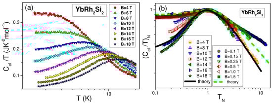 - Oeschler, N.; Hartmann, S.; Pikul, A.; Krellner, C.; Geibel, C.; Steglich, F. Low-temperature specific heat YbRh2Si2. Phys. B 2008, 403, 1254. [Google Scholar] [CrossRef]