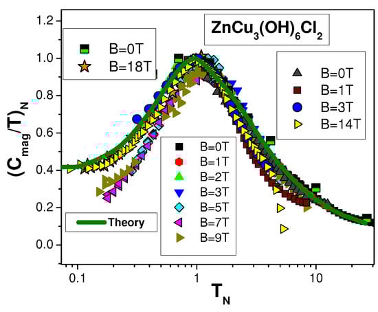 - Shaginyan, V.R.; Msezane, A.Z.; Popov, K.G.; Japaridze, G.S.; Stephanovich, V.A. Identification of strongly correlated spin liquid in herbertsmithite. Europhys. Lett. 2012, 97, 56001. [Google Scholar] [CrossRef][Green Version]