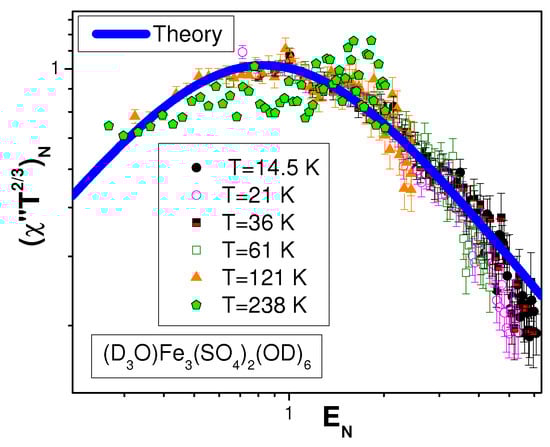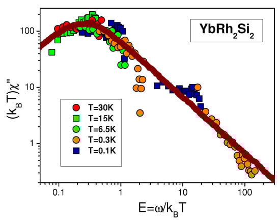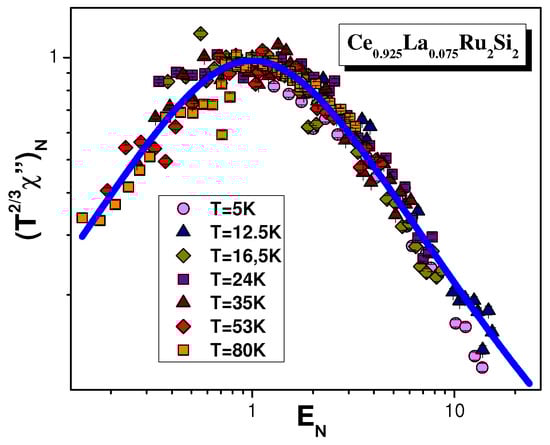 (Color online) Normalized dynamic spin susceptibility , showing scaling properties. The data are taken from those on the HF metal [55]. The full line is defined by Equation (12) [19].