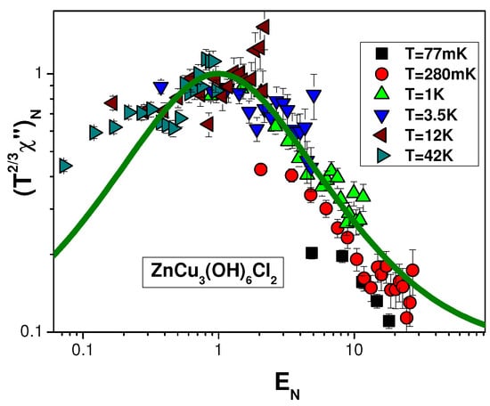 - Helton, J.S.; Matan, K.; Shores, M.P.; Nytko, E.A.; Bartlett, B.M.; Qiu, Y.; Nocera, D.G.; Lee, Y.S. Dynamic Scaling in the Susceptibility of the Spin-1/2 Kagome Lattice Antiferromagnet Herbertsmithite. Phys. Rev. Lett. 2010, 104, 147201. [Google Scholar] [CrossRef] [PubMed]