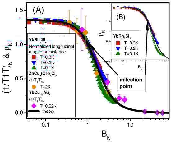Finally, we consider the magnetic field influence on the spin-lattice relaxation rate . Figure 13A shows the normalized quantity as a function of the magnetic field. It shows that with a magnetic field increase, decays progressively. Contrary to the previous cases, where the normalization has been fulfilled in the point of maximum, here we normalize our curves in the inflection point, , marked by the arrows in the main panel and inset. The same procedure has been performed with the normalized magnetoresistance shown in the inset to Figure 13. The relation shows that our system located near its QCP would exhibit similar behavior of [16,17,20,21]. Significantly, Figure 13A shows that the normalized spin-lattice relaxation rate of herbertsmithite [61] and the HF metal [62] do exhibit the same behavior. As seen from Figure 13A for (or ), the quantity is almost magnetic-field-independent. At the same time, at elevated magnetic fields it decays [16,17,20,21] according to