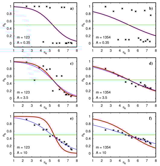 The many-body states with energies above E mean are artificial since they correspond to negative temperatures due to the finite number of orbitals considered in our model. Therefore, we limit our studies to the lower half of the energy spectrum 29 E 39 E mean (for M = 16 , L = 7 ). In Figure 2, we compare the thermalized Fermi–Dirac occupation number n ( ε ) with the occupation numbers n k for two eigenstates at level numbers m = 123 (1354, with m = 1 corresponding to the ground state) with approximate energy eigenvalue E 32 ( E 35 ) for three different Åberg parameters A = 0.35 , A = 3.5 and A = 10 . These states are not too close to the ground state but still quite far below the band center.