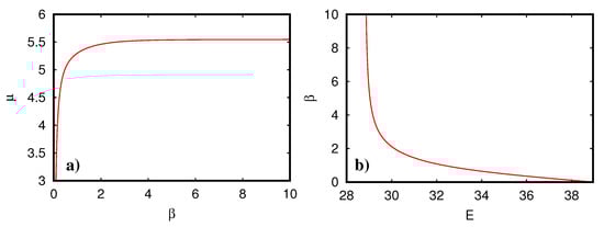 Figure 3. Dependence of chemical potential μ on inverse temperature β = 1 / T (a) and of β = 1 / T on energy E (b) where β and μ are determined from (12) for a given energy E.